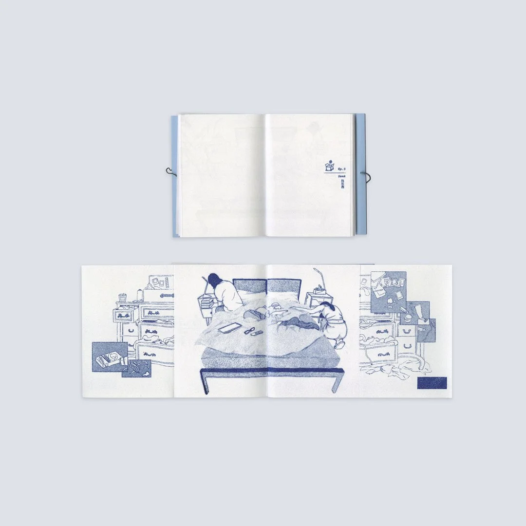 Blue was chosen as the project’s dominant hue — “a quiet color,” they said, “with a slight sense of detachment, yet full of warmth.” The graininess and layering of the risograph gave the pages a tactile intimacy. Even the imperfections — a blur here, a shift there — became pauses in a conversation, moments that felt real, unedited, and deeply human.