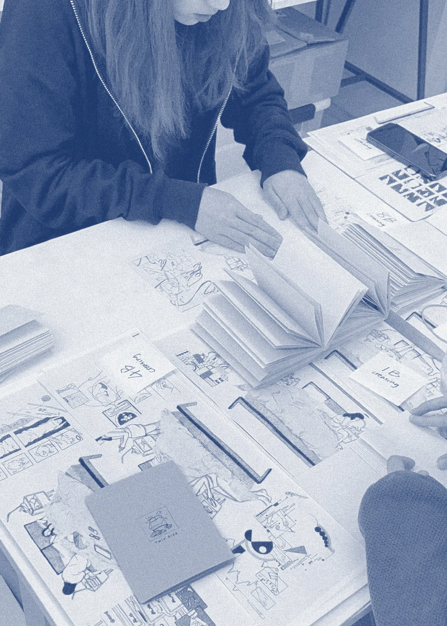 For the book project, they drew inspiration from a unique binding sample at Lucky Risograph. Through long conversations with their mentors, they conceived a stream-of-consciousness artist book co-created from start to finish. The imagery moved fluidly between memory and imagination, logic and intuition. Symbolic characters emerged — extensions of their identities and temperaments — and through these characters, they captured the subtle, shared moments of twin life: arguments, reconciliations, silent companionship, journaling side by side.